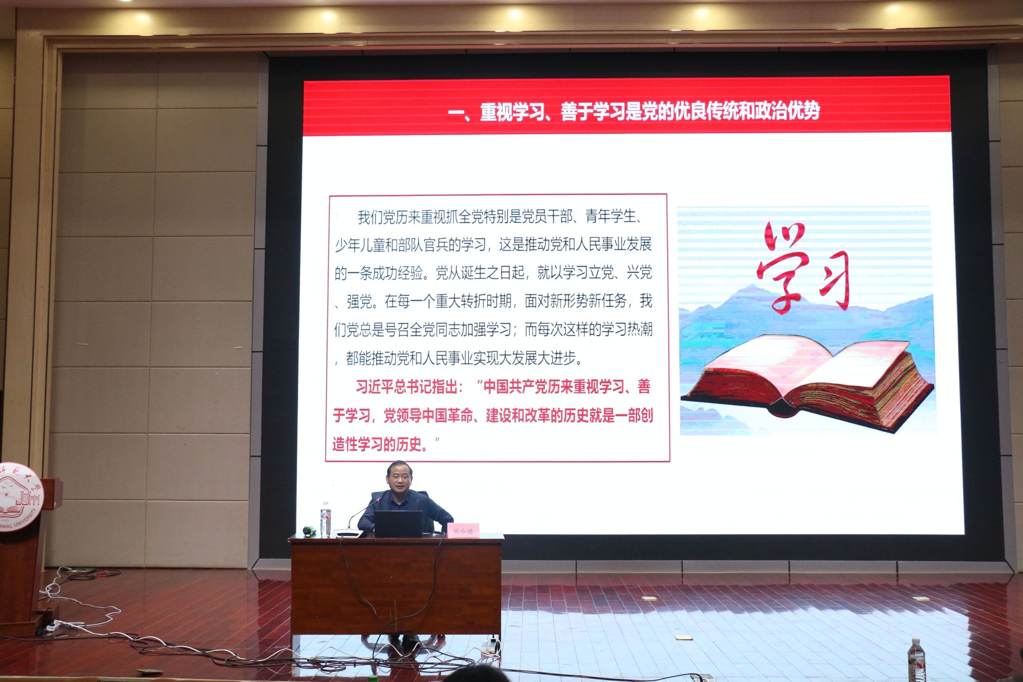 随后,主持学院行政工作的副院长吴少进教授为大讲堂作题为《依靠学习走向未来——新时代新征程基层学习的重点、形式和方法》的首场报告。吴教授围绕新时代基层学习的核心议题,从历史经验、现存问题、总体要求、重点内容、基本形式及提升路径六个维度展开系统阐述。他回顾了中国共产党重视学习、善于学习的优良传统,深入剖析当前基层学习中存在的主要问题,强调要以政治学习为根本,突出理论底色,强化问题导向。他指出,新征程上的基层学习应当处理好个人自学与集体研讨的辩证关系,在“挤劲、钻劲、韧劲”中下功夫,在“有字之书”与“无字之书”的结合中长本领,真正做到学以致用、用以促学、学用相长。与会学生纷纷表示,此次报告既有历史纵深感,又有现实针对性,对深入理解新时代学习的内涵与方法具有重要指导意义。